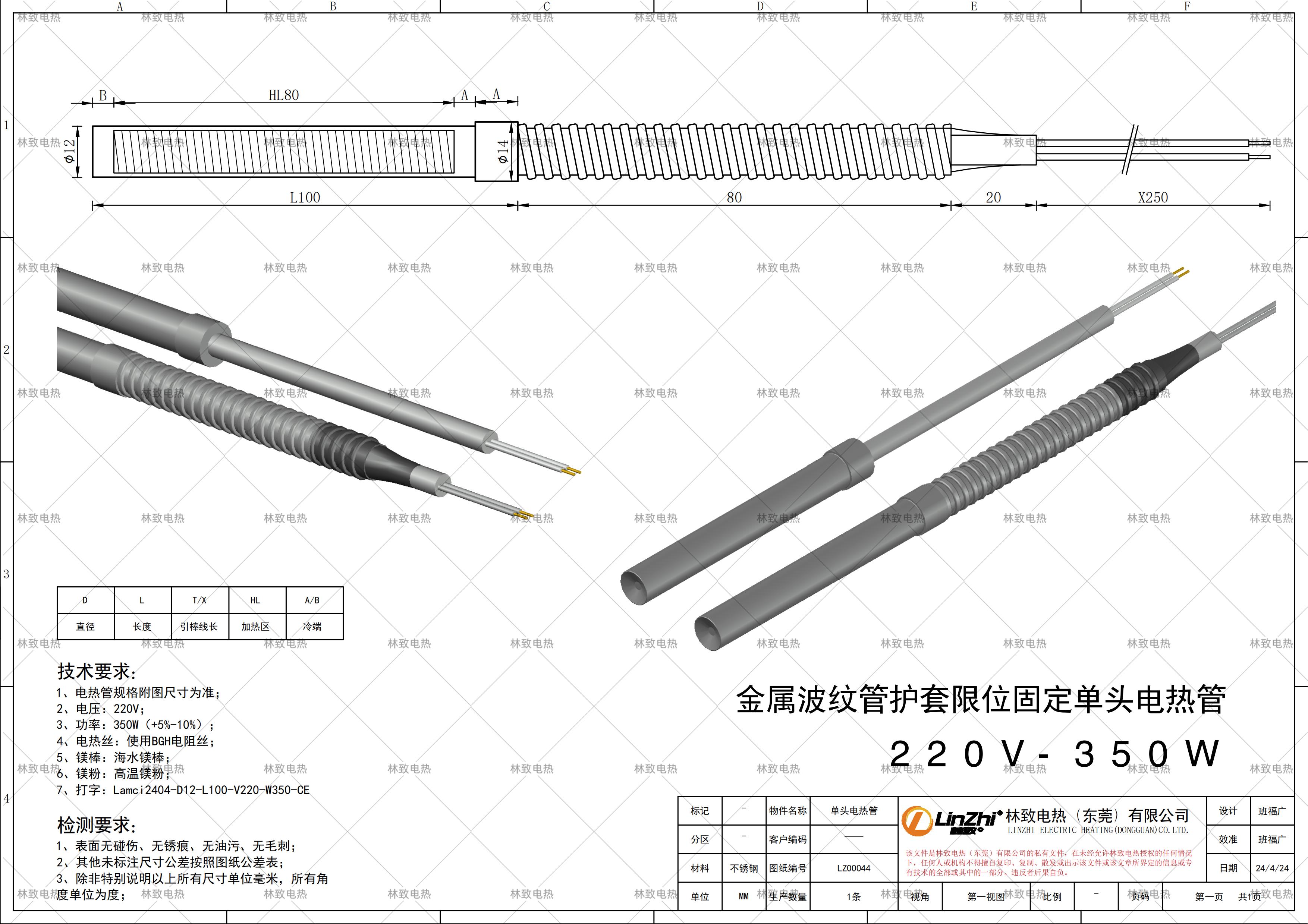 本條產(chǎn)品規(guī)格為下圖紙的規(guī)格*電壓*功率*線長,如需要定制其他規(guī)格請聯(lián)系林致電熱給我們數(shù)據(jù),聯(lián)系林致電熱可以把圖紙截圖或者報本圖紙編碼:LZ00044即可。