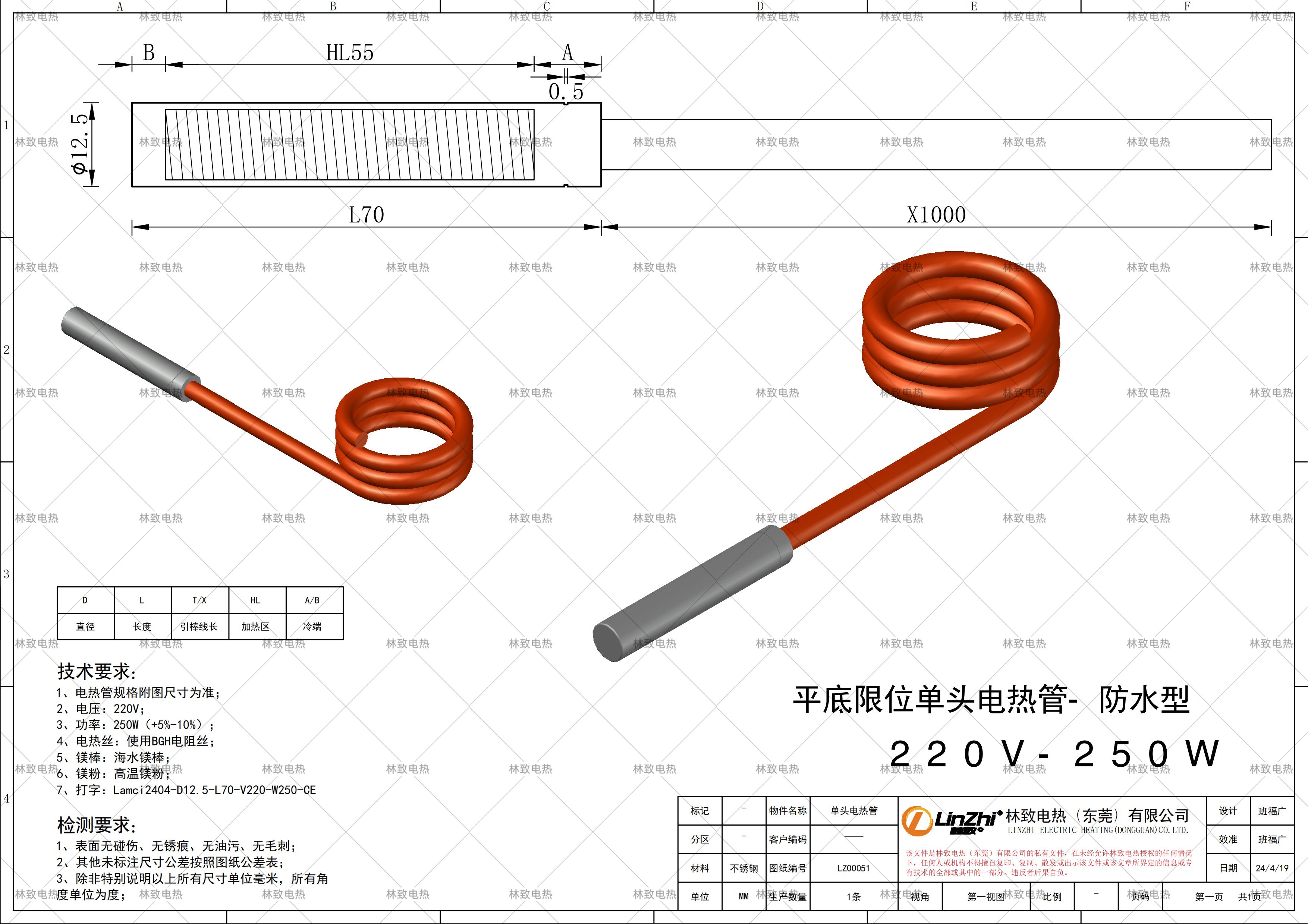 本條產(chǎn)品規(guī)格為下圖紙的規(guī)格*電壓*功率*線長,如需要定制其他規(guī)格請聯(lián)系林致電熱給我們數(shù)據(jù),聯(lián)系林致電熱可以把圖紙截圖或者報本圖紙編碼:LZ00051即可。