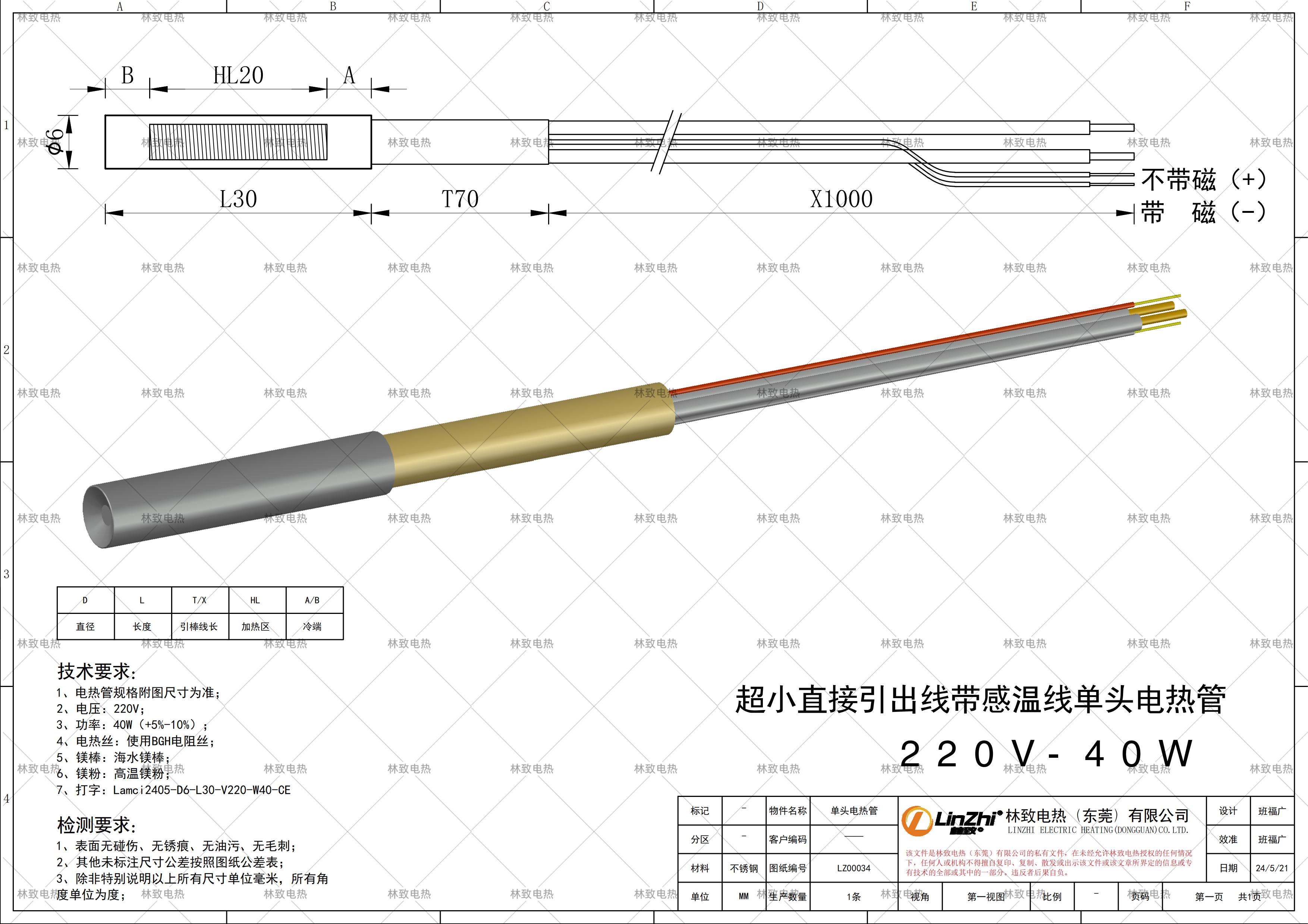 本條產(chǎn)品規(guī)格為下圖紙的規(guī)格*電壓*功率*線長,如需要定制其他規(guī)格請聯(lián)系林致電熱給我們數(shù)據(jù),聯(lián)系林致電熱可以把圖紙截圖或者報本圖紙編碼:LZ00034即可。