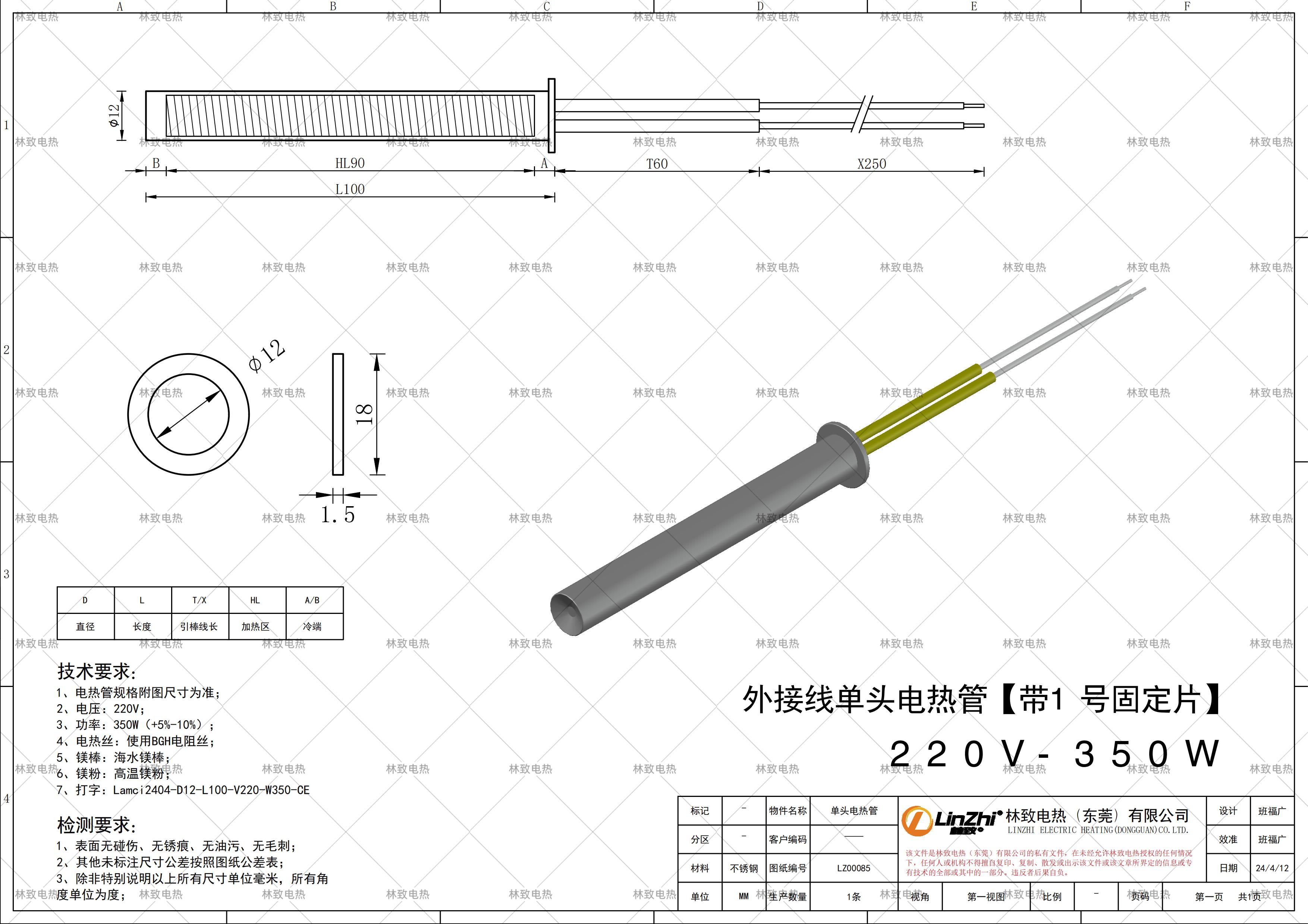 本條產(chǎn)品規(guī)格為下圖紙的規(guī)格*電壓*功率*線長,如需要定制其他規(guī)格請聯(lián)系林致電熱給我們數(shù)據(jù),聯(lián)系林致電熱可以把圖紙截圖或者報本圖紙編碼:LZ00085即可。
