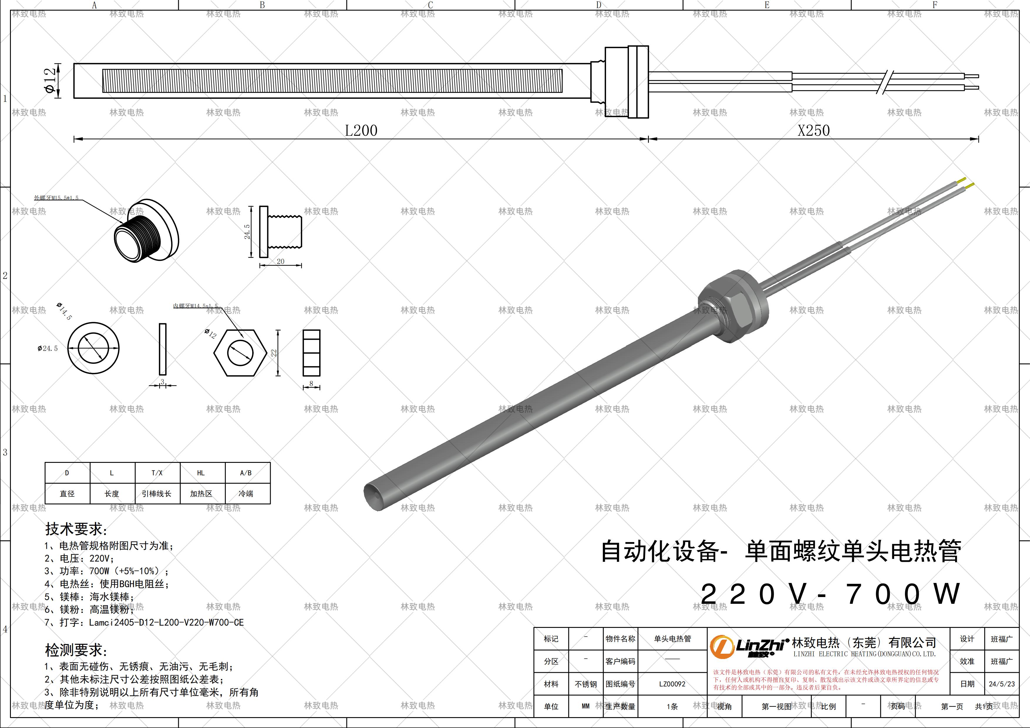 本條產(chǎn)品規(guī)格為下圖紙的規(guī)格*電壓*功率*線長,如需要定制其他規(guī)格請聯(lián)系林致電熱給我們數(shù)據(jù),聯(lián)系林致電熱可以把圖紙截圖或者報本圖紙編碼:LZ00092即可。