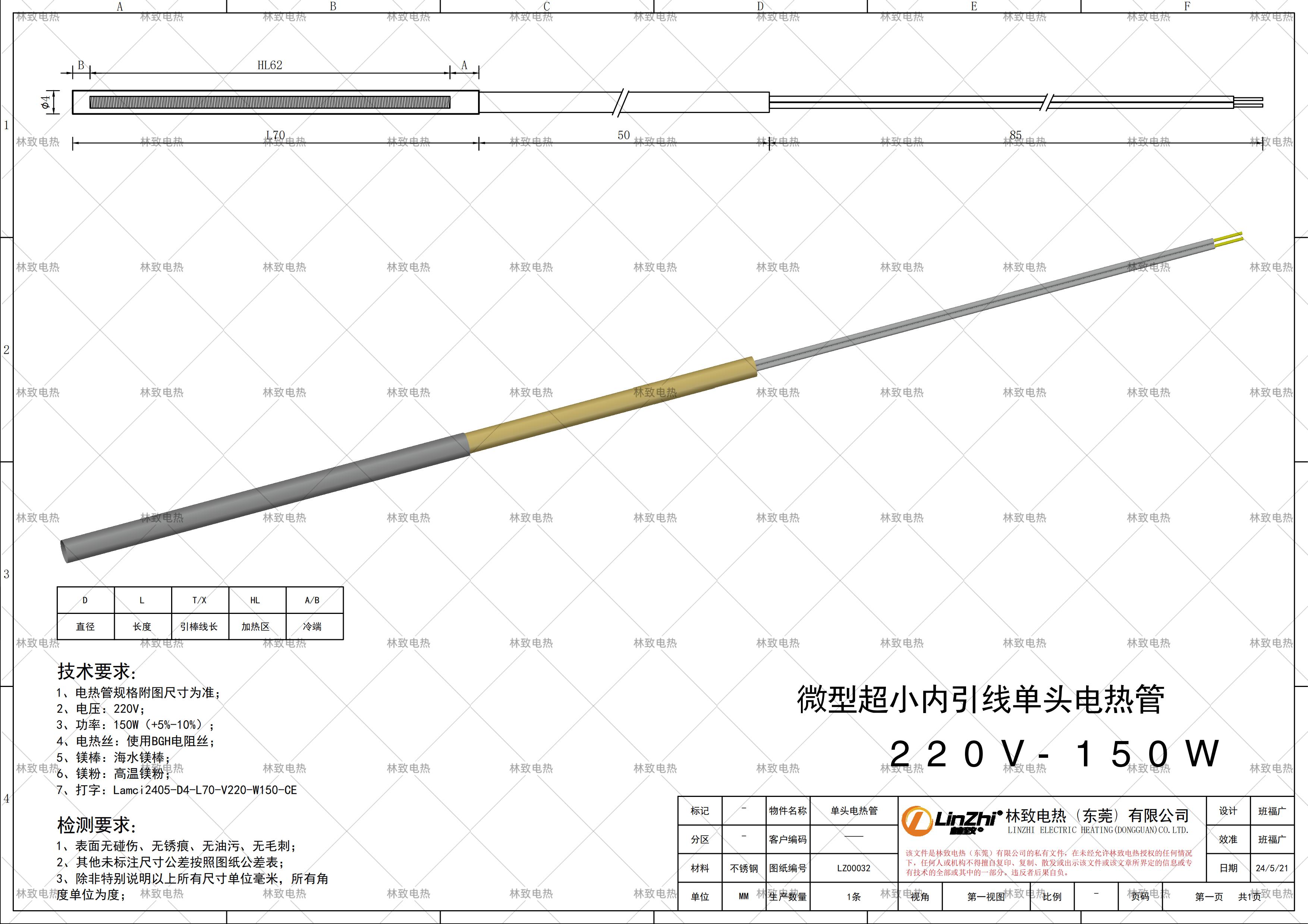 本條產(chǎn)品規(guī)格為下圖紙的規(guī)格*電壓*功率*線長,如需要定制其他規(guī)格請聯(lián)系林致電熱給我們數(shù)據(jù),聯(lián)系林致電熱可以把圖紙截圖或者報本圖紙編碼:LZ00032即可。