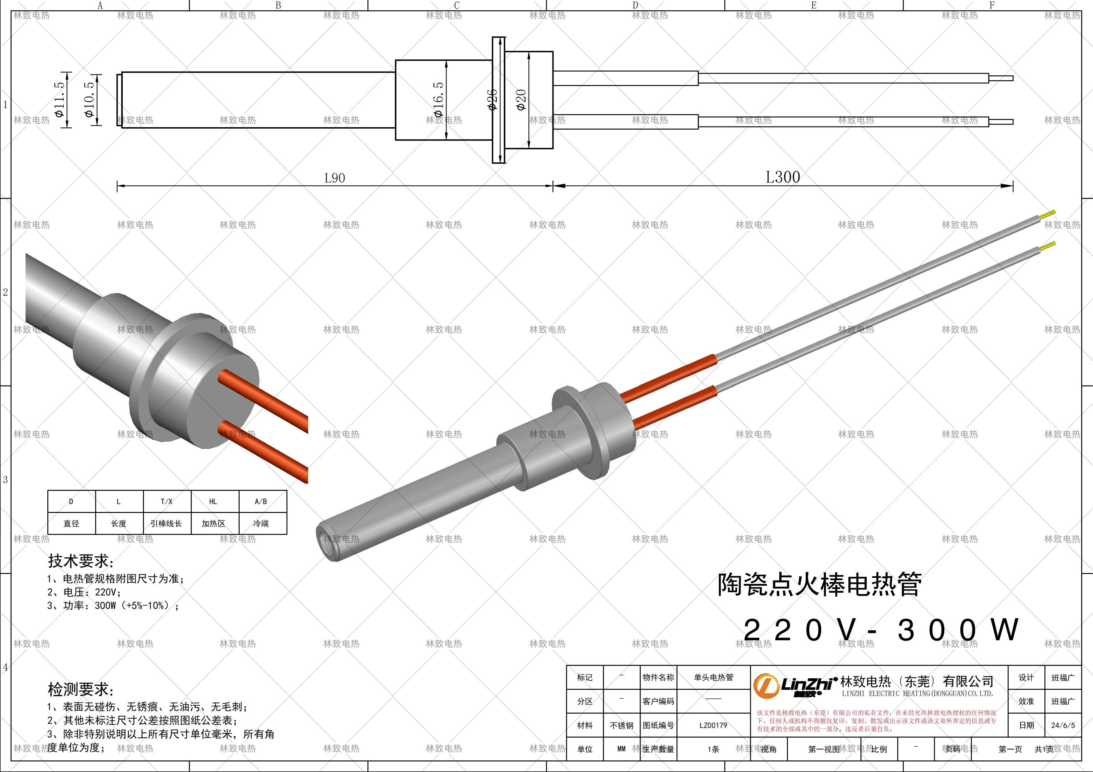 本條產(chǎn)品規(guī)格為下圖紙的規(guī)格*電壓*功率*線長,如需要定制其他規(guī)格請聯(lián)系林致電熱給我們數(shù)據(jù),聯(lián)系林致電熱可以把圖紙截圖或者報本圖紙編碼:LZ00179即可。