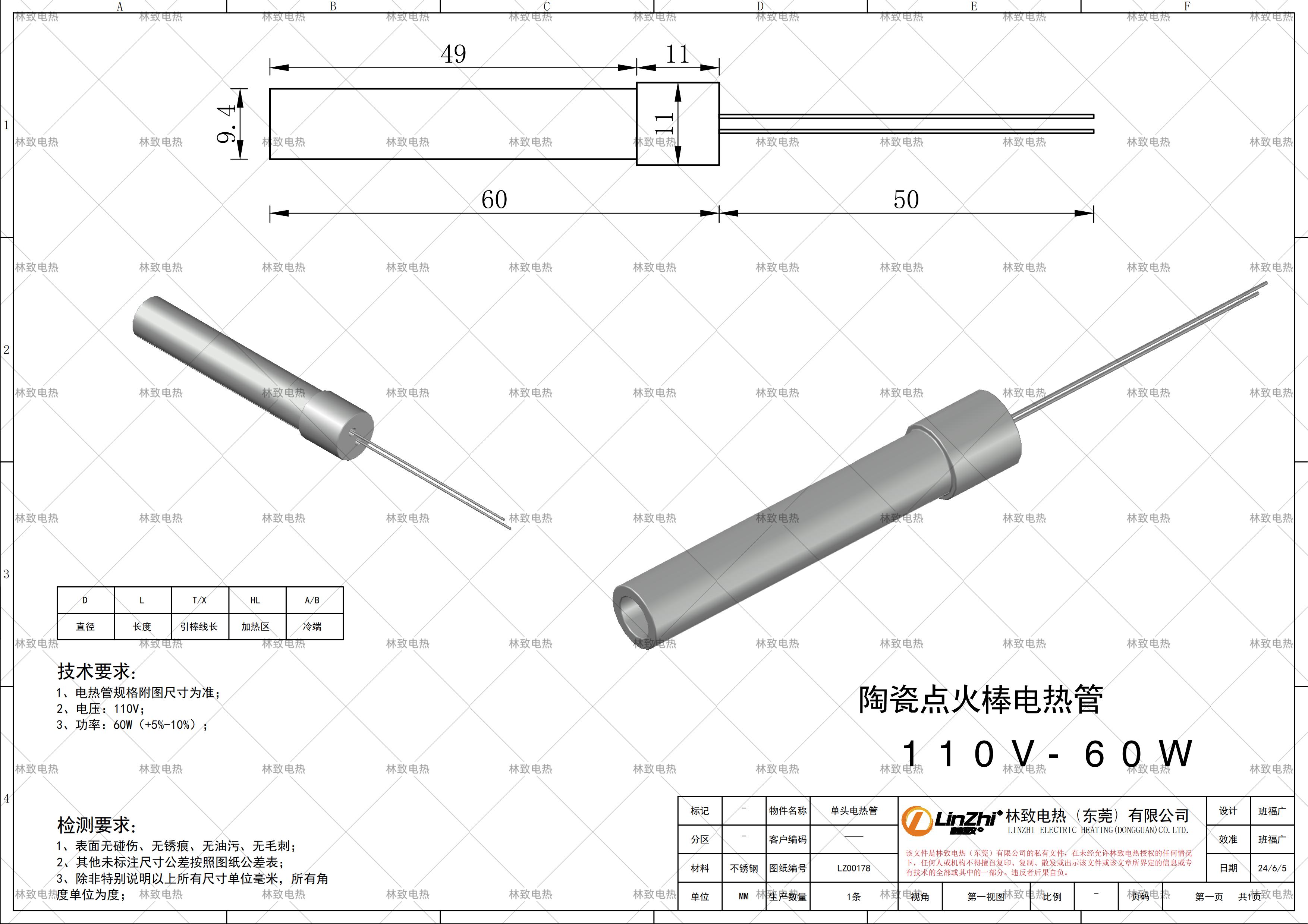 本條產(chǎn)品規(guī)格為下圖紙的規(guī)格*電壓*功率*線長,如需要定制其他規(guī)格請聯(lián)系林致電熱給我們數(shù)據(jù),聯(lián)系林致電熱可以把圖紙截圖或者報本圖紙編碼:LZ00178即可。