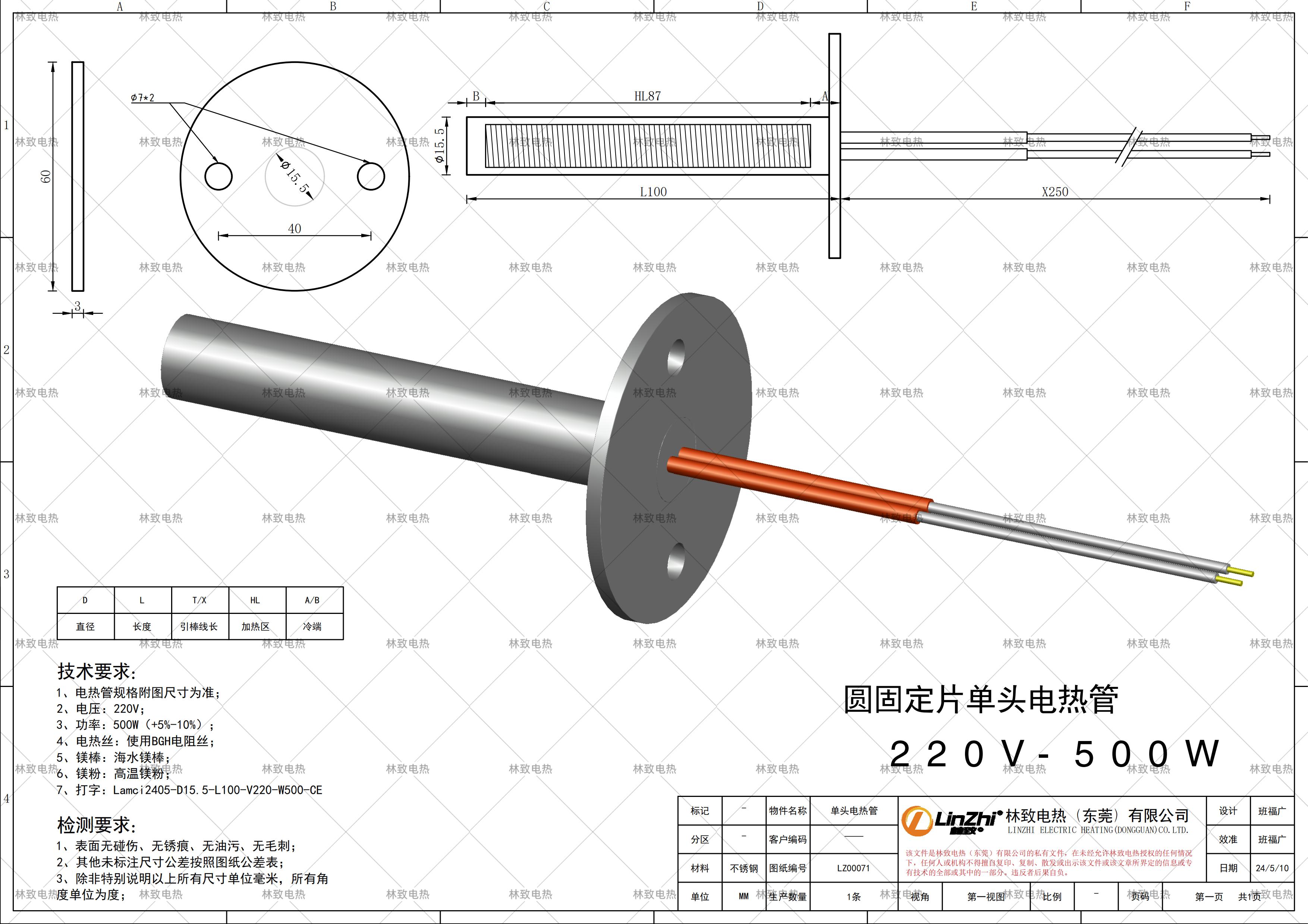 本條產(chǎn)品規(guī)格為下圖紙的規(guī)格*電壓*功率*線長(zhǎng),如需要定制其他規(guī)格請(qǐng)聯(lián)系林致電熱給我們數(shù)據(jù),聯(lián)系林致電熱可以把圖紙截圖或者報(bào)本圖紙編碼:LZ00071即可。