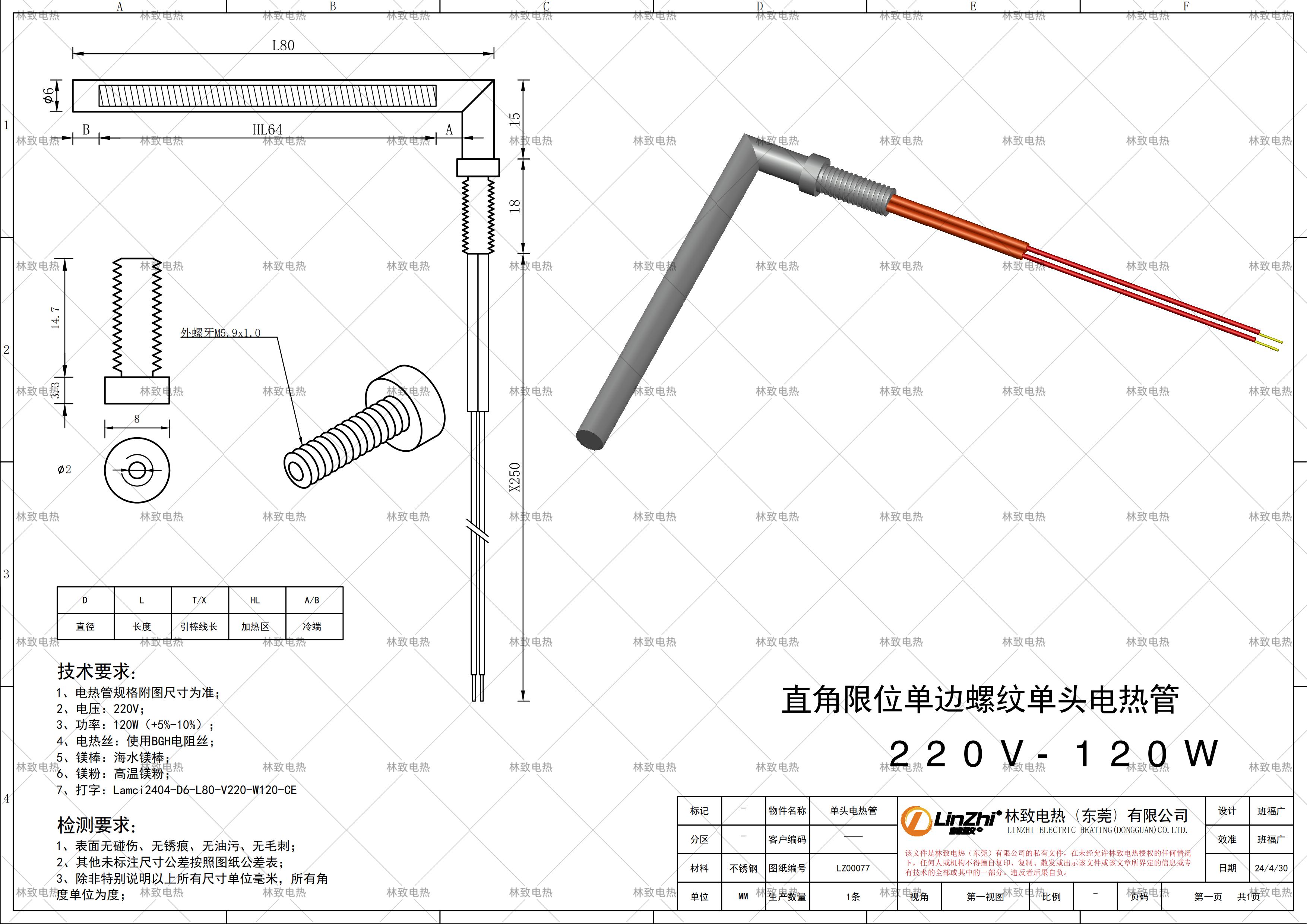 本條產(chǎn)品規(guī)格為下圖紙的規(guī)格*電壓*功率*線長,如需要定制其他規(guī)格請聯(lián)系林致電熱給我們數(shù)據(jù),聯(lián)系林致電熱可以把圖紙截圖或者報本圖紙編碼:LZ00077即可。