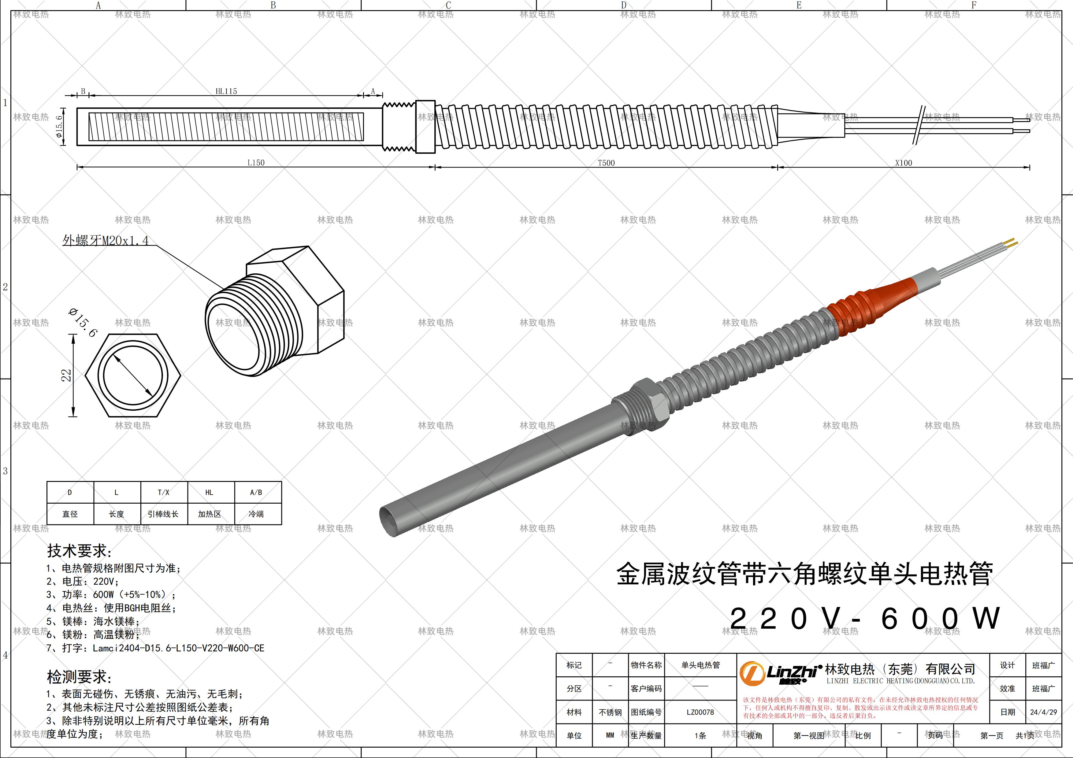 本條產(chǎn)品規(guī)格為下圖紙的規(guī)格*電壓*功率*線長(zhǎng),如需要定制其他規(guī)格請(qǐng)聯(lián)系林致電熱給我們數(shù)據(jù),聯(lián)系林致電熱可以把圖紙截圖或者報(bào)本圖紙編碼:LZ00078即可。