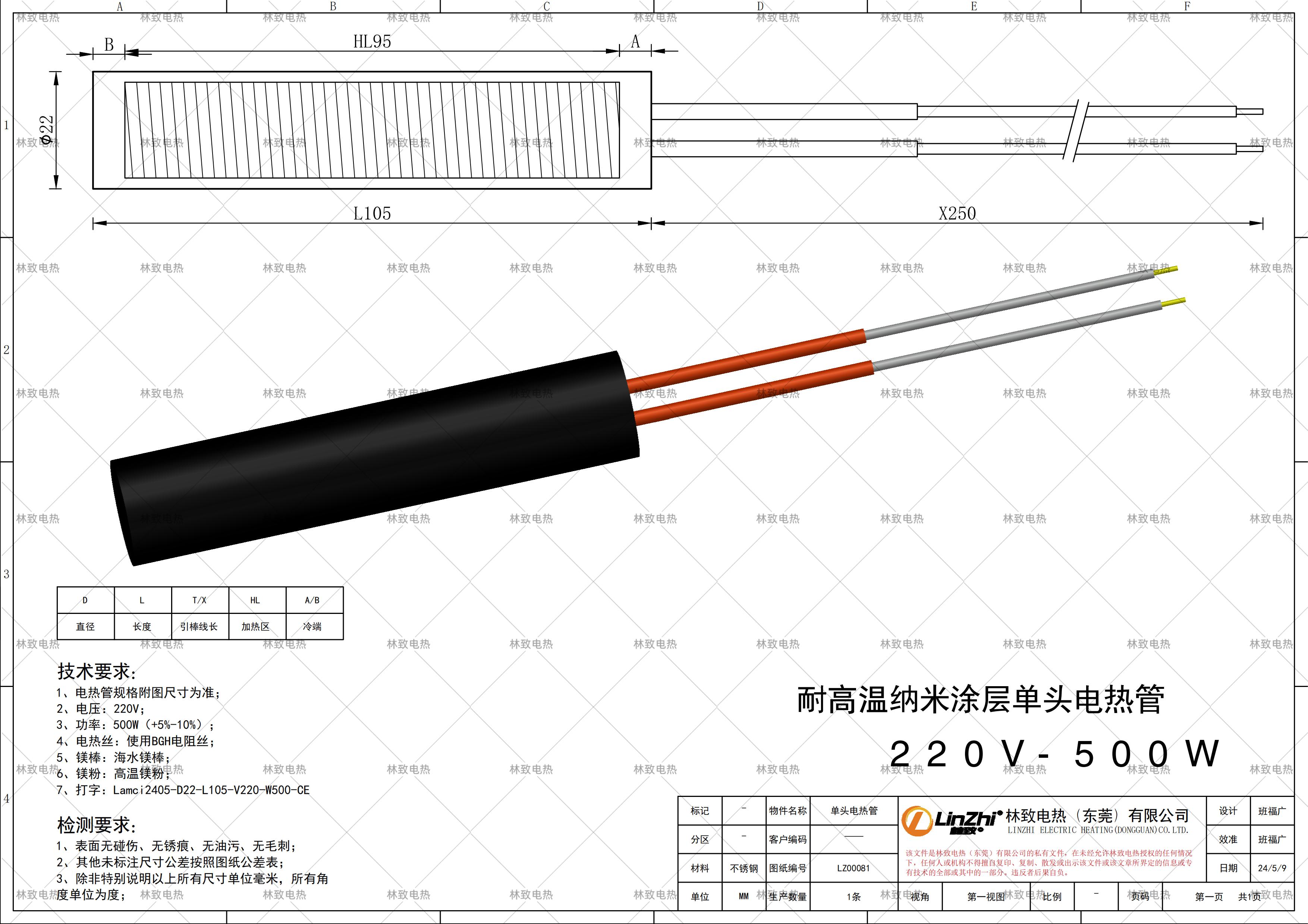 本條產(chǎn)品規(guī)格為下圖紙的規(guī)格*電壓*功率*線長,如需要定制其他規(guī)格請聯(lián)系林致電熱給我們數(shù)據(jù),聯(lián)系林致電熱可以把圖紙截圖或者報本圖紙編碼:LZ00081即可。