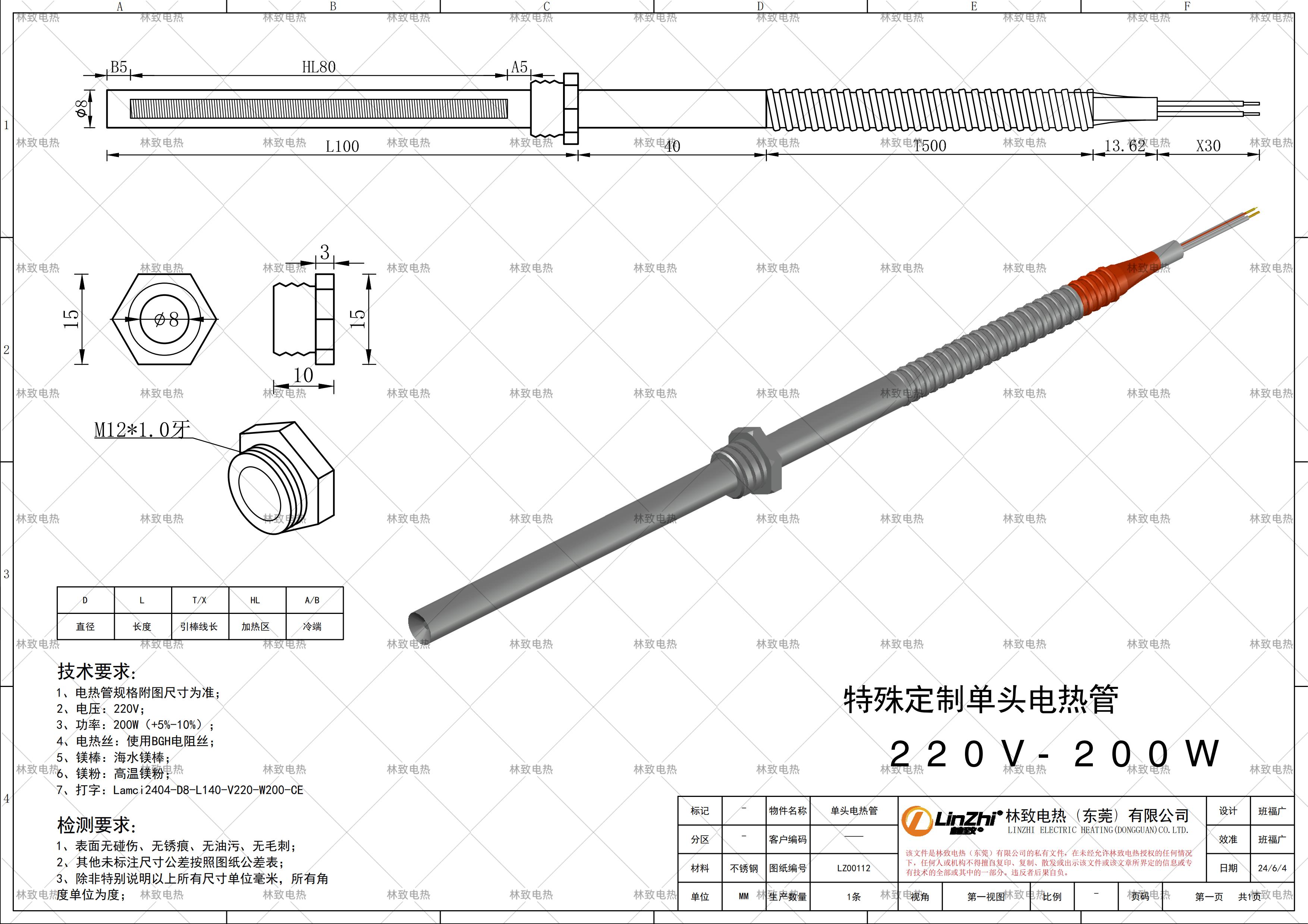 本條產(chǎn)品規(guī)格為下圖紙的規(guī)格*電壓*功率*線長(zhǎng),如需要定制其他規(guī)格請(qǐng)聯(lián)系林致電熱給我們數(shù)據(jù),聯(lián)系林致電熱可以把圖紙截圖或者報(bào)本圖紙編碼:LZ00112即可。