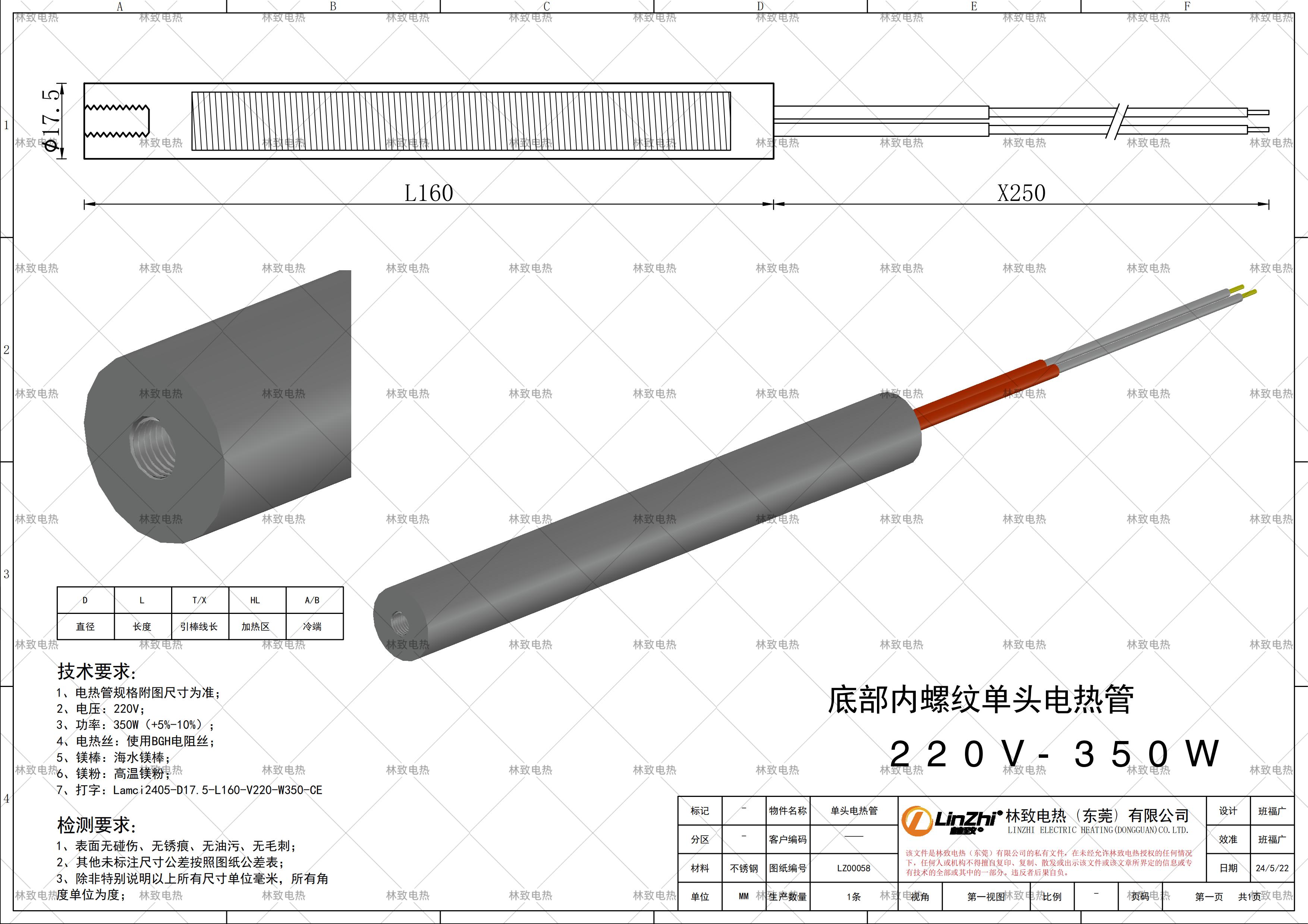 本條產(chǎn)品規(guī)格為下圖紙的規(guī)格*電壓*功率*線長(zhǎng),如需要定制其他規(guī)格請(qǐng)聯(lián)系林致電熱給我們數(shù)據(jù),聯(lián)系林致電熱可以把圖紙截圖或者報(bào)本圖紙編碼:LZ00058即可。