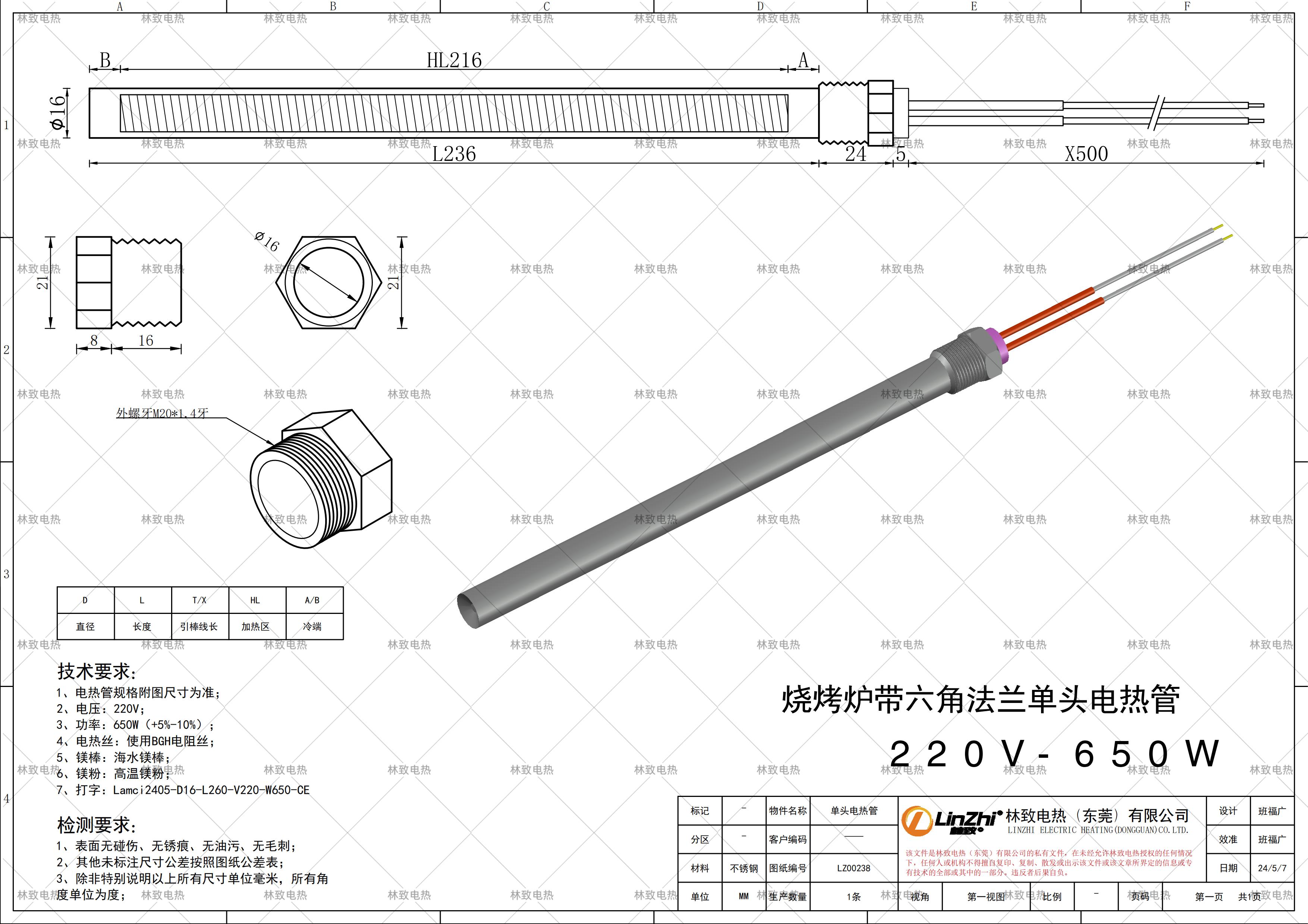 本條產(chǎn)品規(guī)格為下圖紙的規(guī)格*電壓*功率*線長,如需要定制其他規(guī)格請聯(lián)系林致電熱給我們數(shù)據(jù),聯(lián)系林致電熱可以把圖紙截圖或者報本圖紙編碼:LZ00238即可。