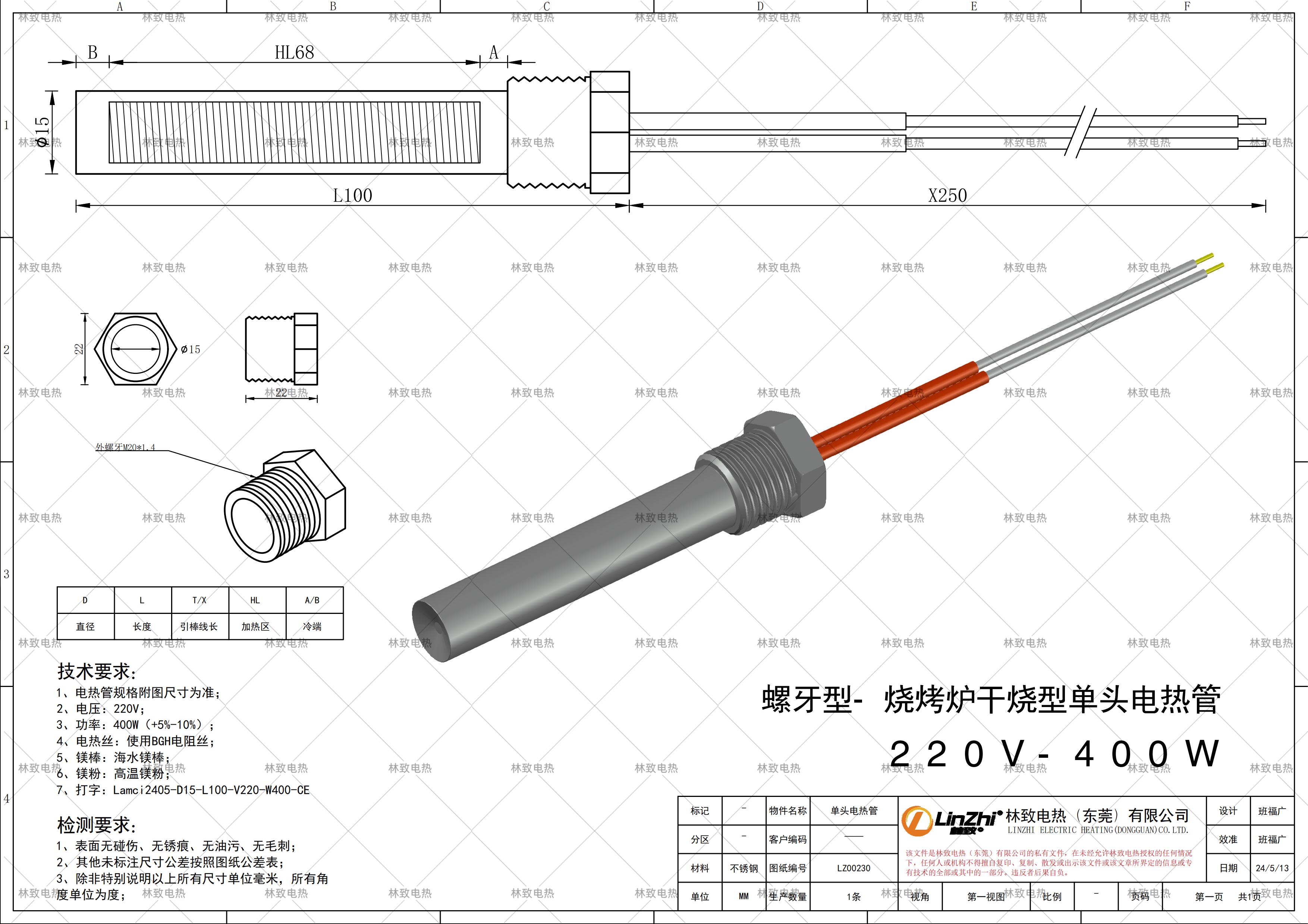 本條產(chǎn)品規(guī)格為下圖紙的規(guī)格*電壓*功率*線長(zhǎng),如需要定制其他規(guī)格請(qǐng)聯(lián)系林致電熱給我們數(shù)據(jù),聯(lián)系林致電熱可以把圖紙截圖或者報(bào)本圖紙編碼:LZ00230即可。